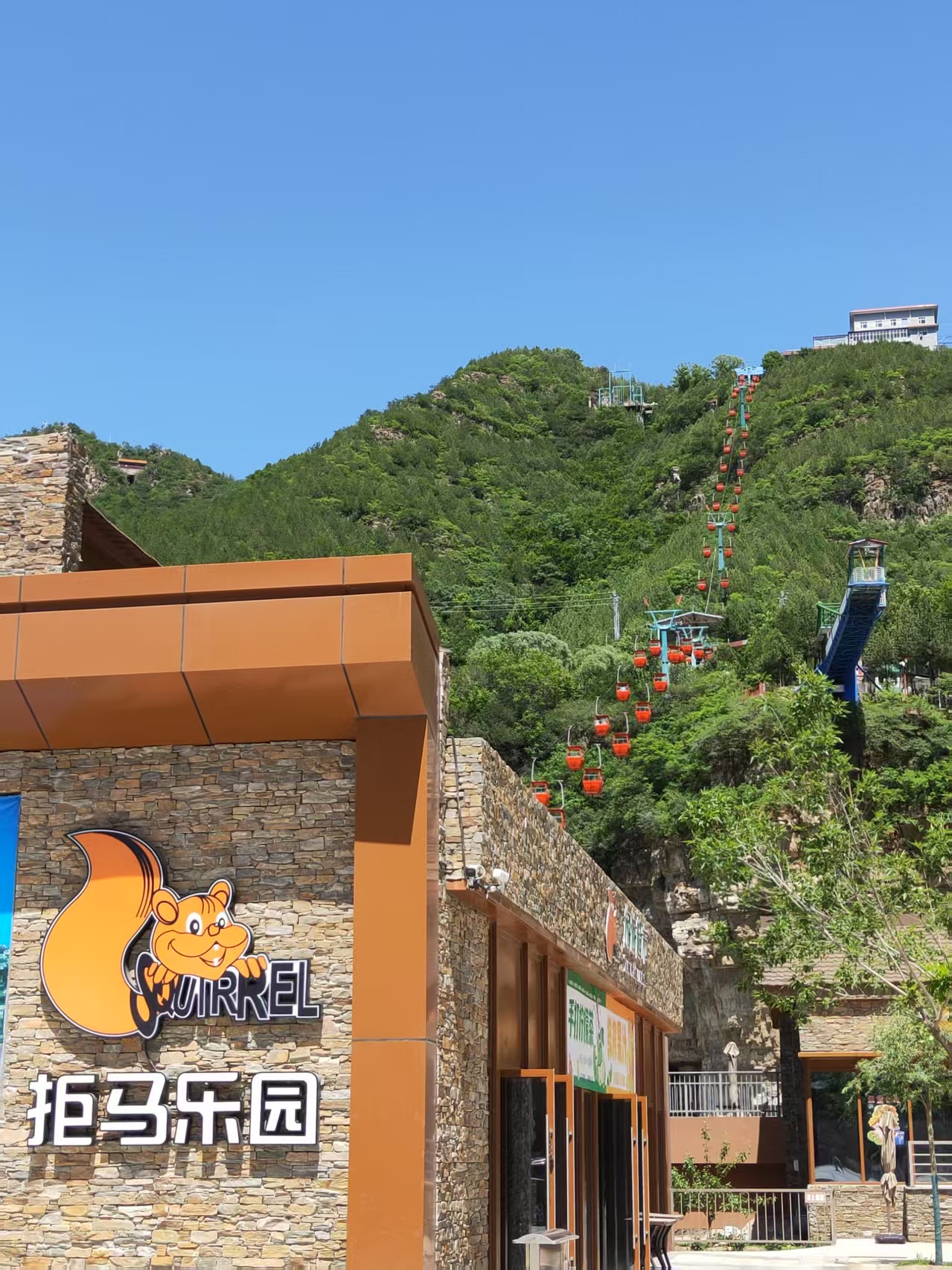 十渡的秋天从不是单调的观光,而是动静皆宜的沉浸式体验。想解锁“勇敢者的勋章”,拒马乐园的55米蹦极绝对是终极选择。站在悬挑的跳台上,脚下是秋波荡漾的拒马河,两岸是五彩山峦,纵身跃下的瞬间,秋风掠过耳畔,所有压力都随尖叫消散在山谷里。若想温和地俯瞰秋色,可乘坐空中客车直达南山观景台,凭栏远眺时,蜿蜒的河流与层叠的彩林构成一幅流动的山水画卷,随手一拍都是年度壁纸。