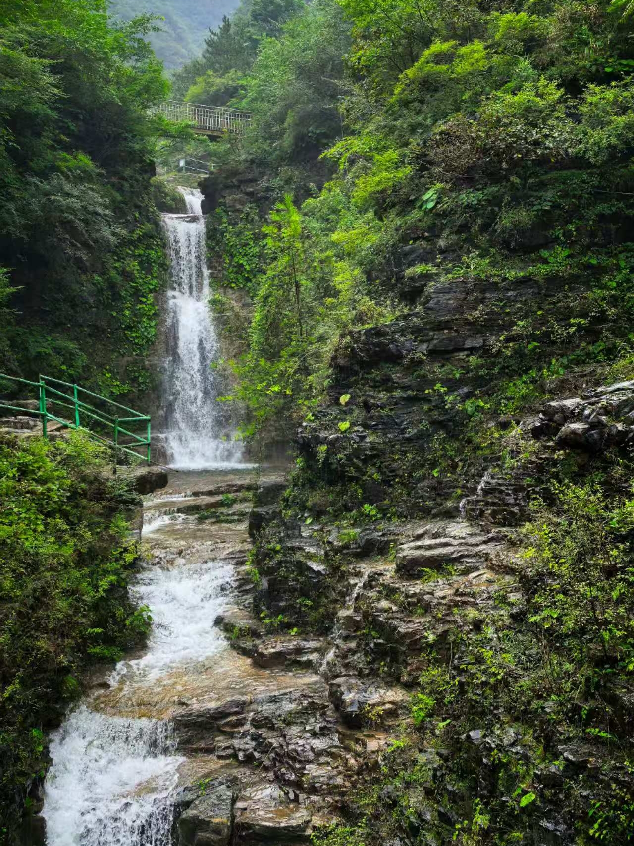 偏爱自然野趣的话,七渡孤山寨藏着秋日的惊喜。踏入景区先闯孤山寨铁索桥,晃悠悠的桥身在秋风中轻摆,桥下河水清澈见底 。顺着步道前行,“一线天”的缝隙中洒下金色光束,与岩壁上的爬山虎相映成趣;千古河床的卵石被秋水冲刷得温润,赤脚踩上去虽带些凉意,却能真切触摸到秋天的质感。峡谷内,瀑布成群,潭水清澈见底,倒映着青山绿树,沿着蜿蜒的山路前行,清泉潺潺相伴,一路欢歌笑语。