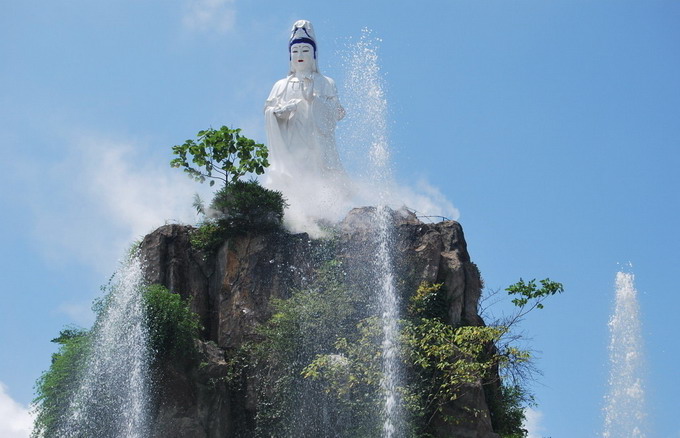 那观音慈善安祥,左手执净瓶,右手拂杨柳枝,朝众人颌首微笑。山民见状喜出望外,立即俯身叩拜,求观章普降甘霖,护佑众生,降伏恶鬼。原来观音云游四方途中曾将净瓶中圣泉之水在孤山寨内倾洒一滴。于是便有了花香草绿山灵水秀的奇观。为解除这个地区百姓疾苦,使家庭美满和谐。