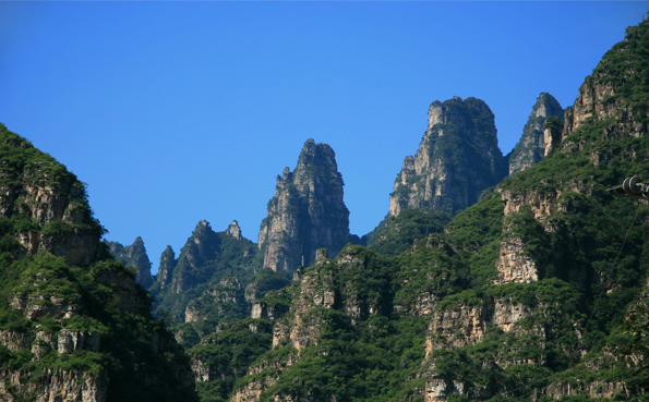 笔架山位于十渡景区的最南端,因它的形状象若干个笔架,故而得名。笔架山只可远眺不可近瞧。远远看去,犹如一副天然水墨山水画。有诗曰:不识庐山真面目,只缘身在此山中。据传是朱熹在这里曾办书院,后来发生了变故,急急离开这里时遗落了许多笔架,如今已成了笔架山。但是也有人看这里的山象盛开的莲花,也有叫它莲花山的。还有人说这里的山象一扇似打开又没有完全打开的屏风,所以又叫隐屏山。